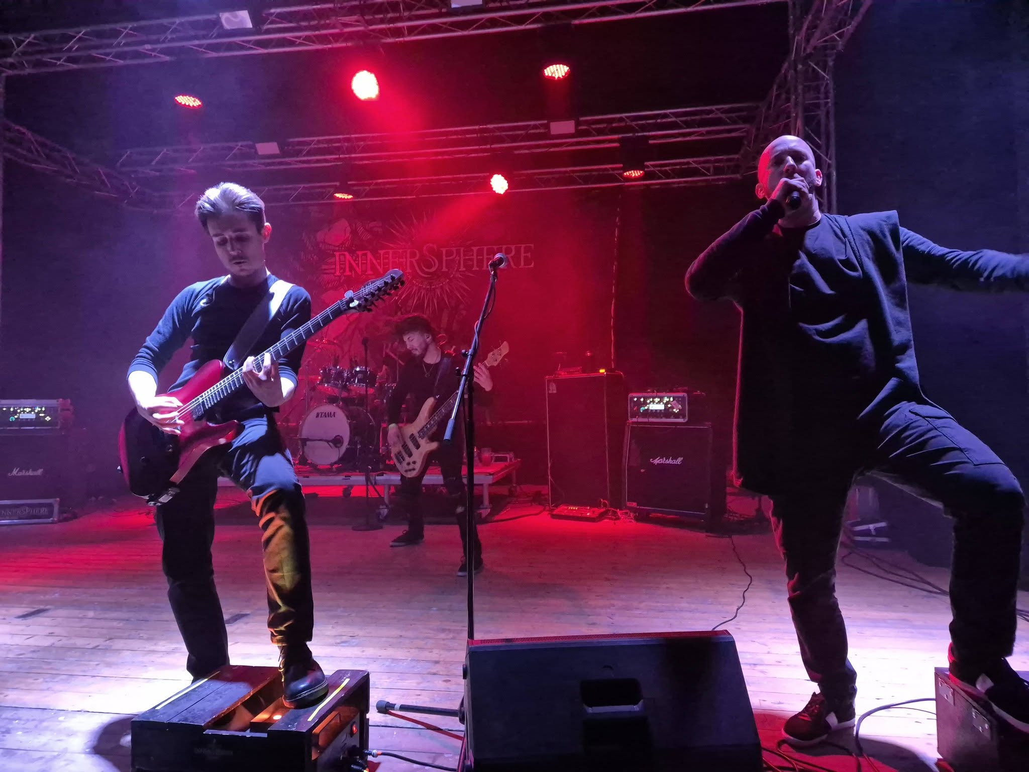 již na pódiu deathmetaloví melodici InnerSphere. Kapela vznikla v roce 2015 v Plzni. Žánrově se řadí k melodickému death metalu s příměsí trash metalu, doom metalu i black metalu. Vyrázným rysem této kapely jsou svébytné growlové a screamové vokály zpěváka Míry Litomerického a melodická Onřejova baskytara .