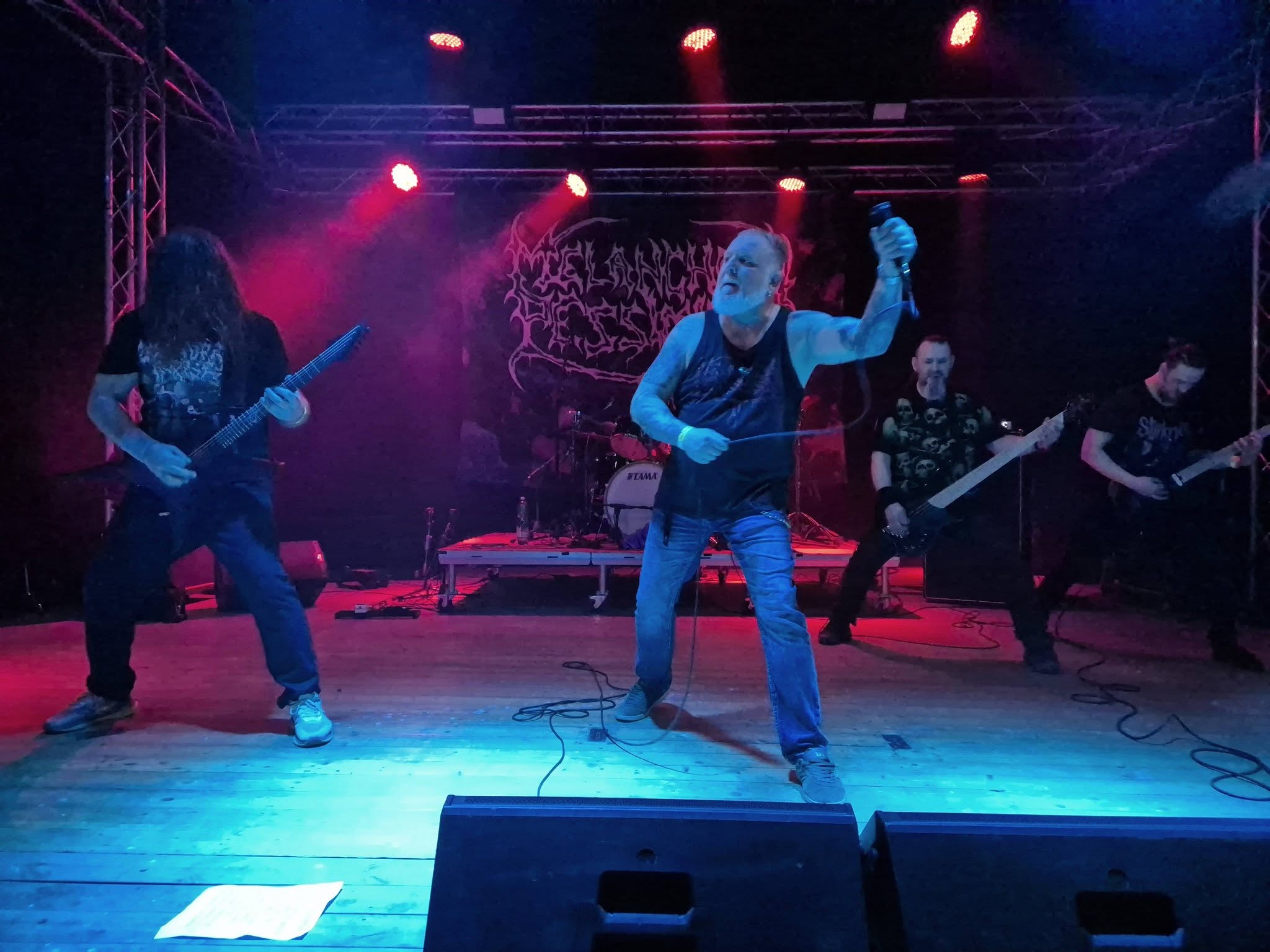 Je 19:10 a na pódiu jsou klasikové, pionýři a průkopníci československého, českého a hlavně moravského death metalu Melancholy Pessimism. Kapela působí na hudební scéně od roku 1992 a z půdodní sestavy zůstali v tomto hudební tělese jen zpěvák Vlasta Killy Mahdal a kytarista Richar ,, Kocůr" Kocour. Vydali devět alb. A dál nechám mluvit zpěváka Vlastíka, protože podle mě by se většina jeho vět měla tesat do kamene. Vlastík mimo jiné podotkl: ,, Je to teď pro horníky a hutníky dost na hovno, když jsou doly a fabriky zavřené! Ale metal zůstává dál!" Melancholy Pessimism otevřeli svůj koncert klenotem Absolutely Without Mood a zpěvák Vlastík dodává: ,, To byla píseň z našeho prvního alba Recompense To Saints, které vyšlo v roce 1996 a letos oslaví neuvěřitelných 30 let od vydání." Kapela postupně představila průřez všemi alby. Zazněly tak písně Burning Symbol, Bloody Killer Trend, Nails of Time, Back to Teh Nature. Zpěvák Vlastík během koncertu řekl ještě toto: ,,Takže teď všichni odhodíme mobilní telefony. To platí hlavně pro mladé! Nebudeme řešit kokotiny! Budem žít! Řeknu vám, že jsme hráli i na jednom velkém festivalu, kde bylo 120 000 lidí, ale taková energie jako je tady v Barráku, tam nebyla. Díky. A ještě musím pochválit nové album Nahum, které je skvělé. A vzpomínám také na natačení klipu k písní Soul Parasites. Natáčelo se ještě ve starém Barráku. Tato píseň je o duševních parasitech, které máme v hlavě. A je nutné je vyhnat. A jak jinak než poctivou hudbou od podlahy." Nasledovala píseň Soul parasites. Kapela pak zakončila svůj bytostný koncert písněmi Pandemic Corruptiom, Modern Stabbing Culture a Melancholy Pessimism. Došlo i k poctě pro kapely Benediction a Master. Zpěvák Vlastík také zmínil, že jeho sousedem je zpěvák, baskytarista a frontman legendární deathmetalové kapely Master z USA Paul Speckmann, který na Jižní Moravě již zdomácněl. Jsme u konce a já ještě dodám, že koncert Melancholy Pessimism patřil k jedním z vrcholů Necro Metal Pilgrims, protože tam bylo všechno. Hutnost. Brutalita. Rychlost. Vynikající zvuk. Melancholici zkrátka zrají jako to nejelpší víno. A já jen doufám, že toto zrání nikdy neskončí.