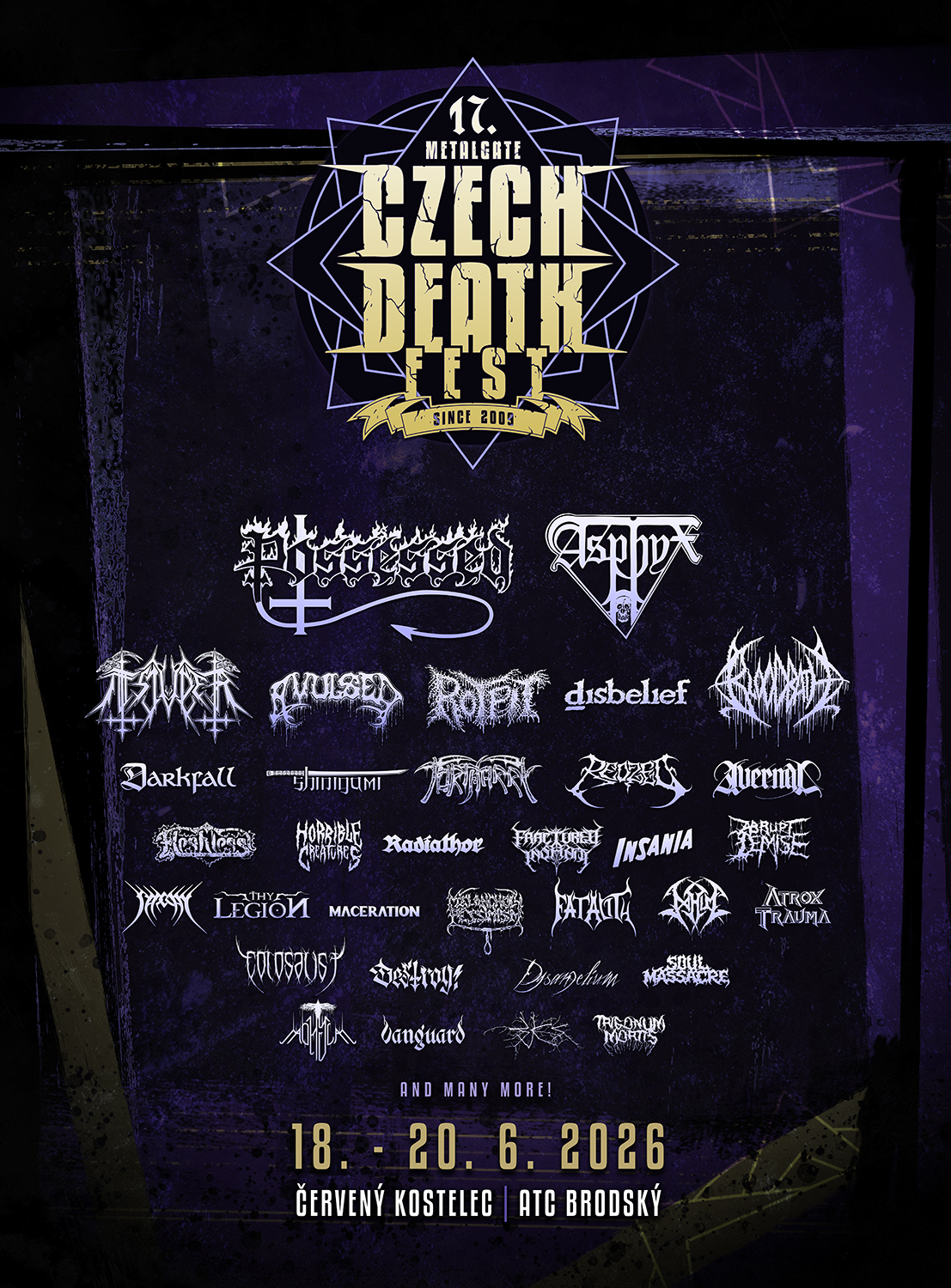 Line-up MGCDF 2026: ABRUPT DEMISE, ASPHYX, ATROX TRAUMA, AVERNAL, AVULSED, BJES, BLOODBATH, COLOSALIST, DARKFALL, DESTROY, DISBELIEF, DYSANGELIUM, FATALITY, FLESHLESS, FRACTURATED INSANITY, HORRIBLE CREATURES, INSANIA, MACERATION, MELANCHOLY PESSIMISM, MOHYLA, NAHUM, POSSESSED, RADIATHOR, REDZED, ROTPIT, SARCOM, SHINIGAMI, SOUL MASSACRE, THY LEGION, TORTHARRY, TRIGONUM MORTIS, TSJUDER, VANGUARD a další
