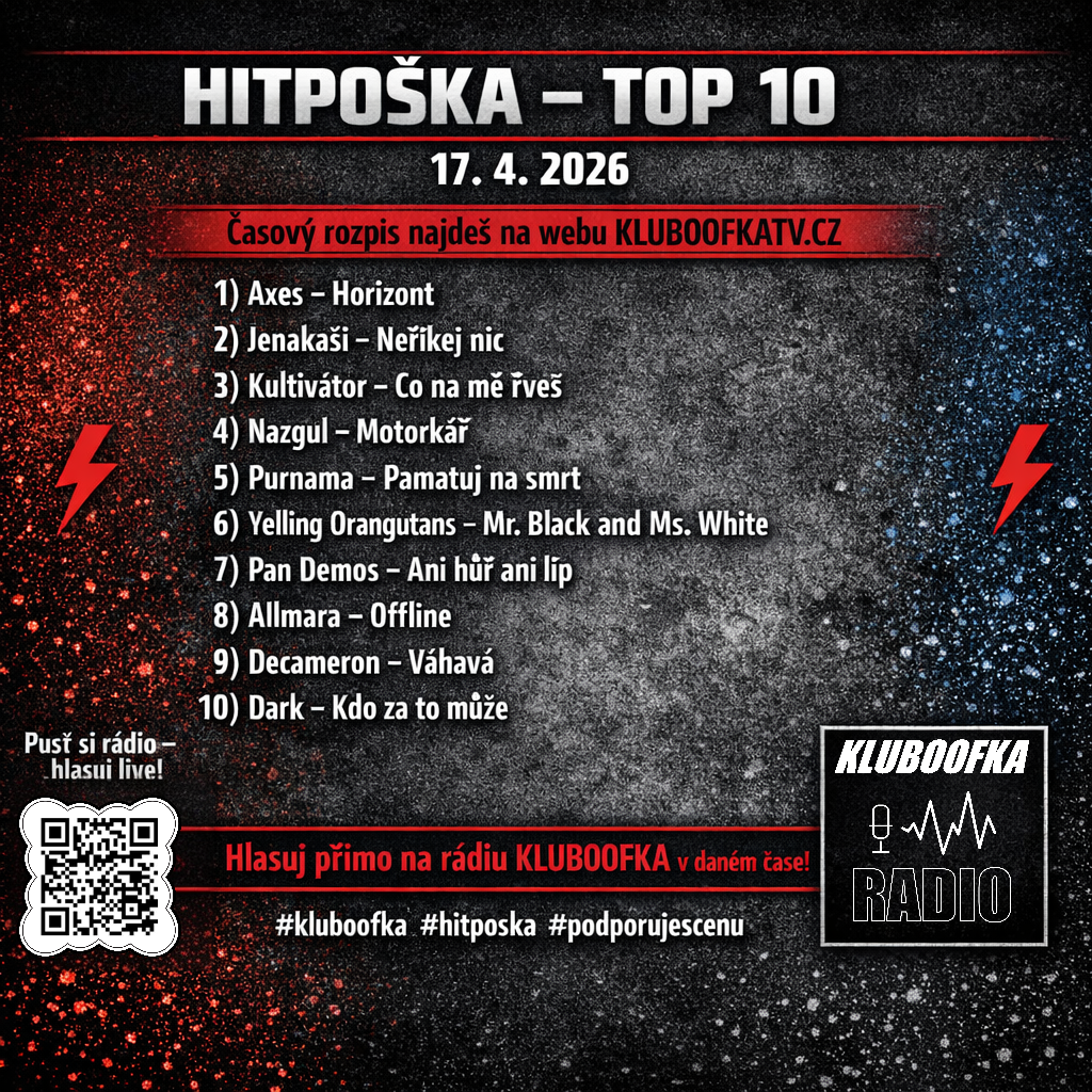 Interaktivní hitparáda Hitpoška, kterou vysílá Rádio Kluboofka, vstoupila do své druhé poloviny. Projekt probíhá od 20. března do 18. května 2026 a nabízí prostor pro české a slovenské rockové a metalové kapely, které soutěží o podporu fanoušků v živém vysílání. Zveřejňujeme aktuální pořadí po první části soutěže.