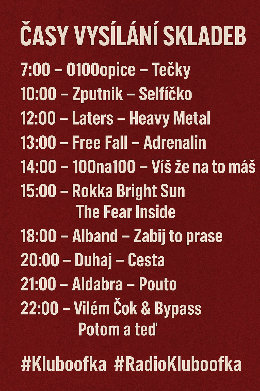 Chceš, aby se tvoje kapela objevila v dalším kole interaktivní hitparády na Rádiu Kluboofka? Máš skladbu, která má sílu oslovit fanoušky rocku, metalu nebo punku? Přihlas se do výběru pro nové hlasování, které odstartuje 20. ledna 2026.