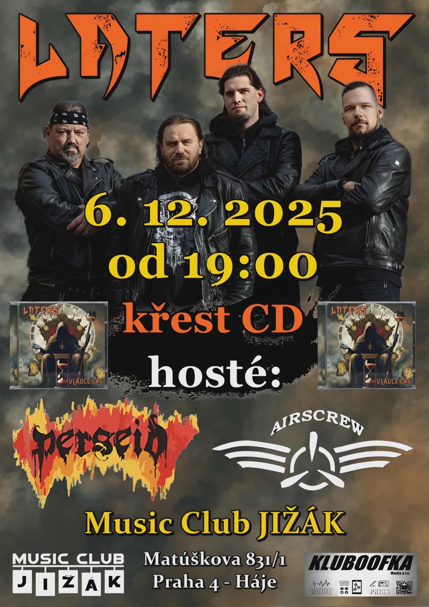 Praha, 6. prosince 2025 – Music Club Jižák se chystá na jedinečný večer, kdy kapela LATERS slavnostně pokřtí své nové CD Vládce Čas. Tento koncert patří mezi nejvýznamnější hudební události prosince 2025 v Praze a osloví fanoušky rocku, metalu i fantasy estetiky.