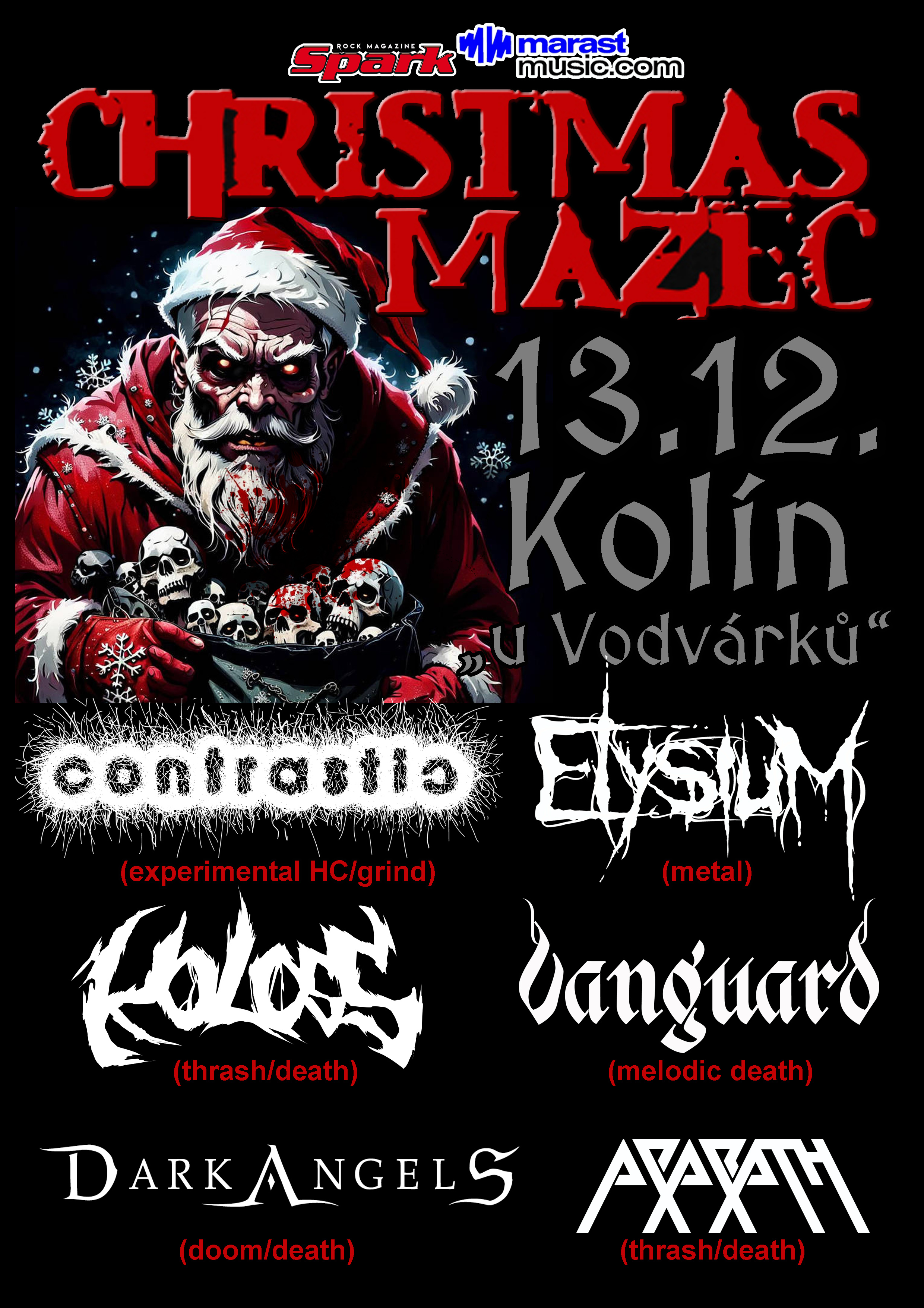 Po několika letech snažení se nám konečně podařilo dotáhnout legendy CONTRASTIC. Kdo je zažil, ví – jejich experimentální HC/grind šílenství je inteligentní chaos, který ale dokonale funguje. Kapela VANGUARD už u nás sice hrála, ale od té doby udělala obrovský krok vpřed. Jejich melodický death metal teď zní ještě vyzráleji a má až hitový náboj. Takže je nejvyšší čas si tuhle jízdu zopakovat. Thrashové srdce s pořádnou dávkou deathmetalové agrese rozbuší mladá krev APARATH a ostřílení borci z Prahy KOLOSS. První jmenovaná banda nám předvede, že metal není mrtvý – naopak, že omladina má pořád co říct a umí to narvat pěkně zostra. Druzí zmiňovaní zase předvedou zkušenost a preciznost ve skládání i prezentaci. Na temnější notu nás vezmou budějovičtí DARK ANGELS. Jejich doom/death je jako tíha mrazivé mlhy, která vás obklopí a nepustí. Temnota, co vás pohltí, ale přesně to co před Vánoci potřebujeme. No a samozřejmě nesmí chybět domácí ELYSIUM – pořádající parta, která vždycky dovede večírek do varu. Hoši to do vás nasypou tak, že se vám bude třást půllitr v ruce. Makají na nových peckách, takže čekejte i čerstvou nálož rovnou která bude kopat do zadku jak Jerry Toma.