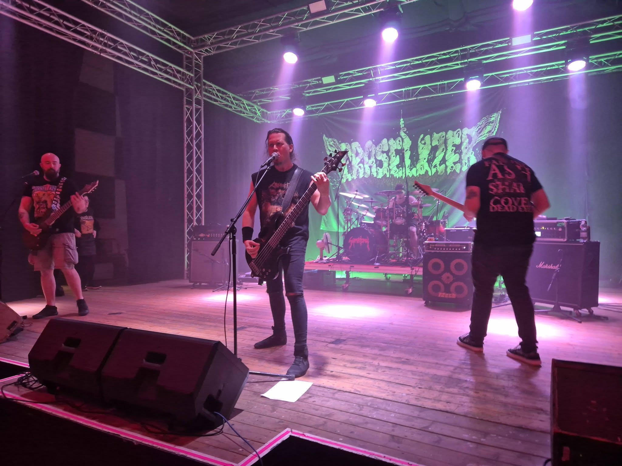 PRASELIZER z nedaleké Orlové vznikli v létě 2006. Takže letos v létě oslaví uctýhodných 20 let na hudební scéně a zahráli si v Rakousku, Polsku, Slovensku i na větším festival Obscene Extreme. V Barráku představili písně z dema Praselizer (2007) a z debutového alba Faecal Addiction (2019). Zazněly tak tato grindcorové a goregrindové pecky s velmi poetickými názvy: Nezákonný nákup mladého nekrofila na místním hřbitově, Anal blast hasičskou hadicí, Fekální závislost, aj. Kapela uzavřela svůj koncert peckami Řitní torpédoborec a Pan smrádek. Bohužel ne vždy se všechno vydaří a PRASELIZER měli na začátku svého koncertu na Bloody Festu značné problémy se zvukem. Zvukový hluk a šum splýval v nečitelnou a jednolitou směs jakéhosi řevu. I growling byl zpočátku velmi tlumený a nevýrazný. Během koncert se však zvuk zlepšil a šel tzv. nahoru a najednou bylo slyšet vše i baskytara. Takže ano. Nakonec šlo o povedený a velmi dynamický koncert, který roztančil publikum v Barráku.